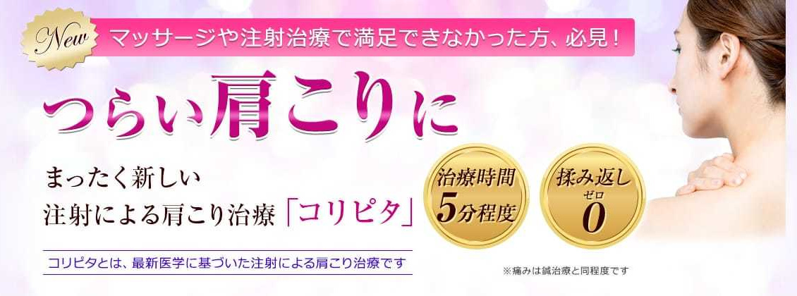 コリピタは、痛みのもとに有効成分を直接注入するので、患部にダイレクトな効果が期待できます。注射後すぐから凝りが取れていくのがわかるという実感が、人気の理由でもあります。